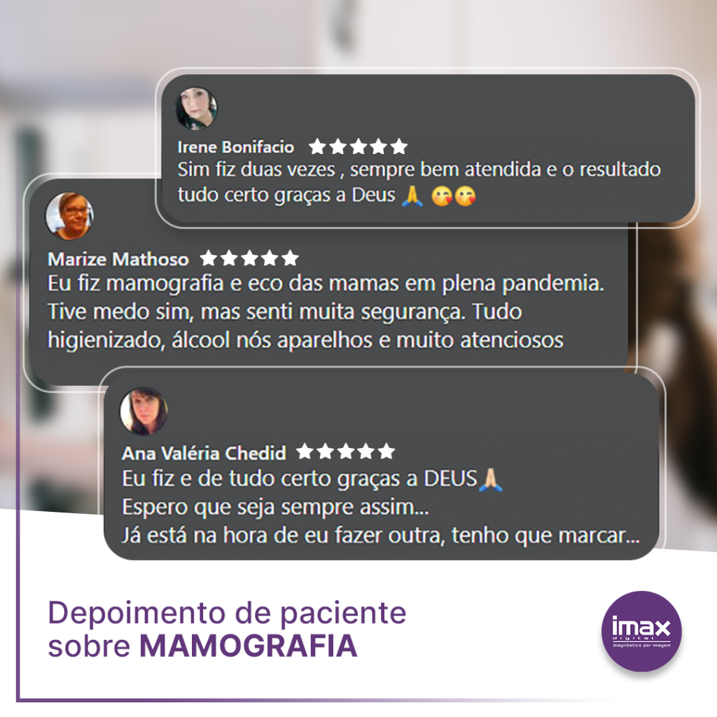 Agradecemos o carinho das pacientes que deixaram seus depoimentos sobre a realização da mamografia na Clínica Imax e incentivam outras mulheres a fazerem seus exames de rotina.