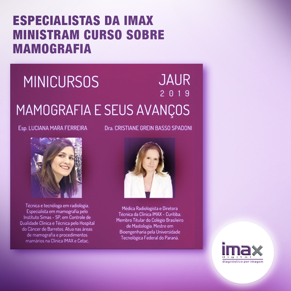 A doutora Cristiane Spadoni, médica radiologista da Clínica Imax, em Curitiba, e a técnica em radiologia especialista em mamografia, Esp. Luciana Mara Ferreira, também da Imax, vão ministrar o minicurso “Mamografia e Seus Avanços”, na primeira edição da Jornada Acadêmica Unificada de Radiologia (JAUR), de 2019.