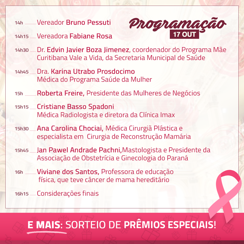 Ela participa de Audiência Pública alusiva ao Outubro Rosa na Câmara Municipal de Curitiba. Com o tema “A importância do diagnóstico precoce para vencer o Câncer de Mama”, o encontro acontece no 4º andar do Anexo II da Câmara e a entrada é gratuita.