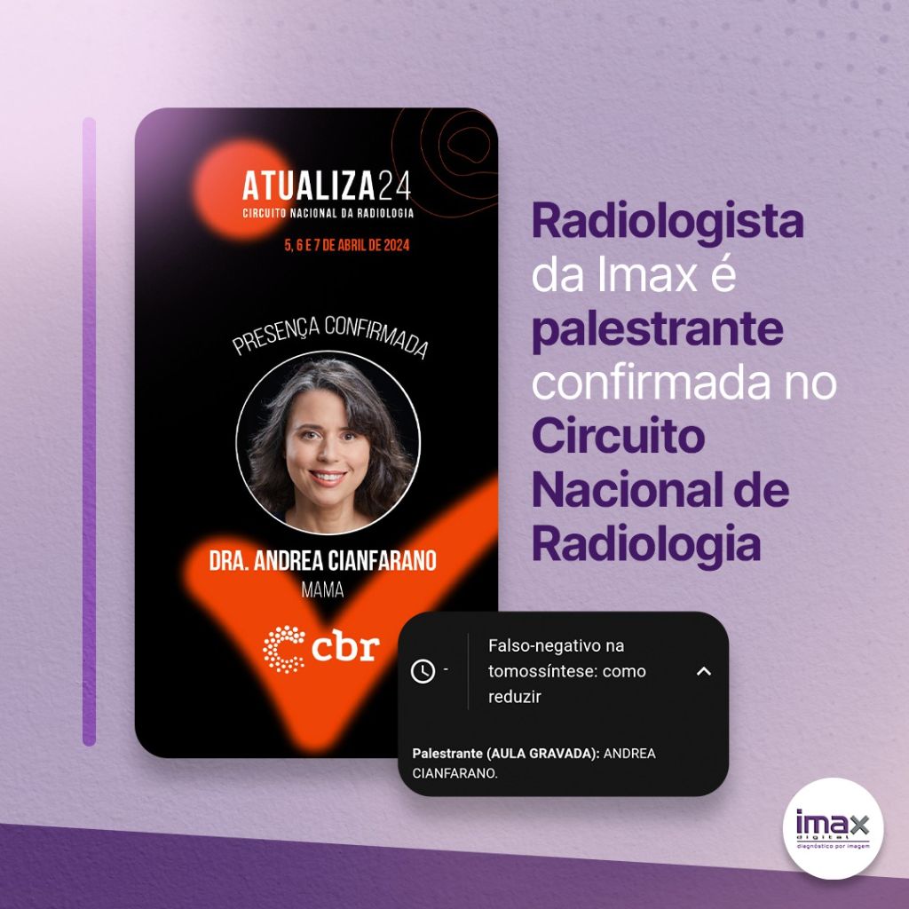 A Dra. Andrea Cianfarano, médica radiologista da Clínica Imax, foi convidada para apresentar a palestra “Falso-negativo na tomossíntese: como reduzir” que é parte do curso “Tomossíntese: a mamografia em evolução” no Circuito Nacional de Radiologia (Atualiza 24).